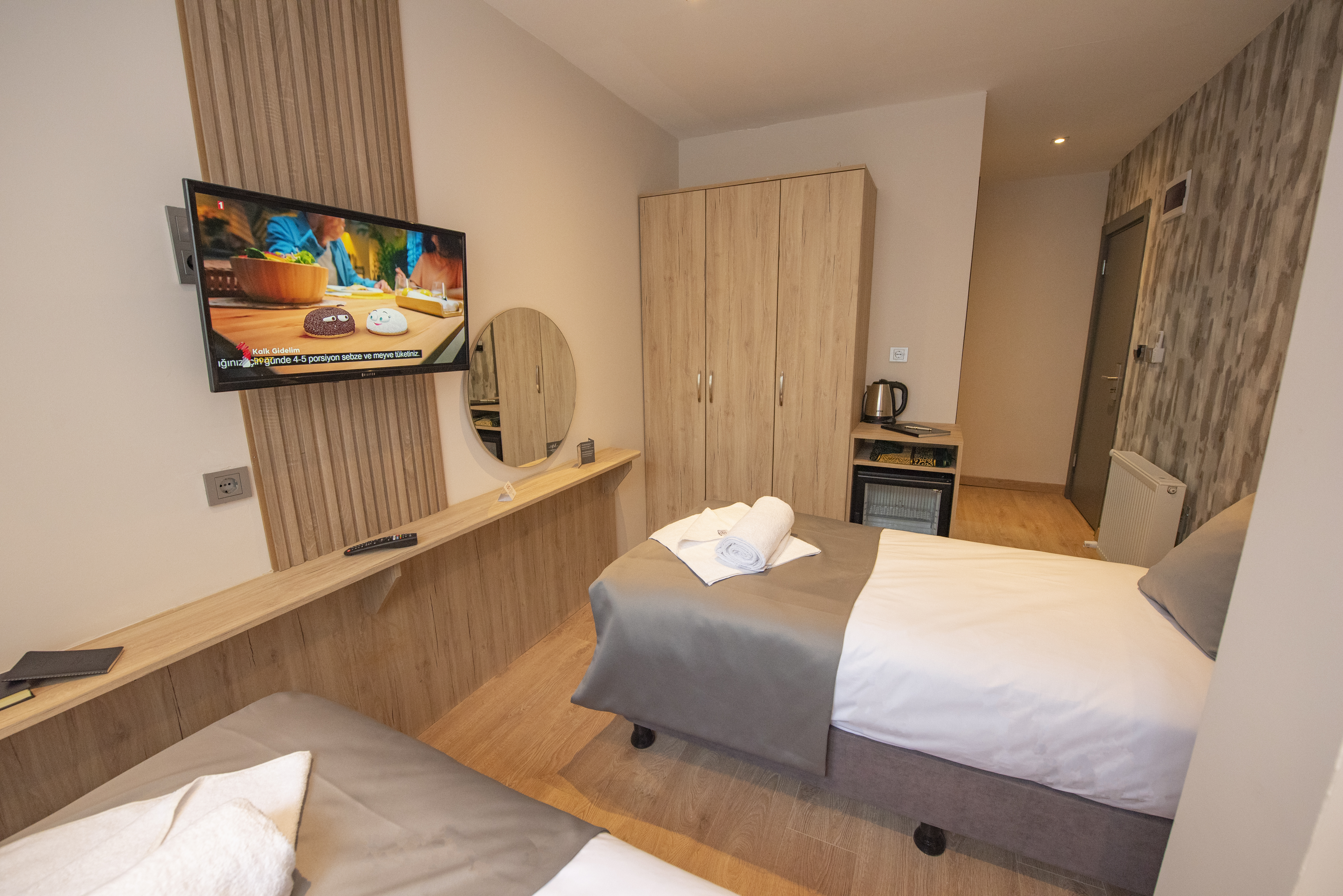 Our standard hotel rooms are perfect for travelers seeking comfortable and convenient accommodation. Each room is equipped with a comfortable queen-size bed and a range of amenities to ensure a pleasant stay. Enjoy a good night's sleep with our plush pillows and cozy linens. Stay connected with our complimentary Wi-Fi and catch up on your favorite shows on our flat-screen TV. Our rooms also feature a work desk, perfect for business travelers who need a quiet space to work. The bathroom includes a shower, complimentary toiletries, and fresh towels. For your convenience, each room comes with a minibar and a safe to store your valuables. Our 24-hour front desk staff is always available to assist with any requests or questions.